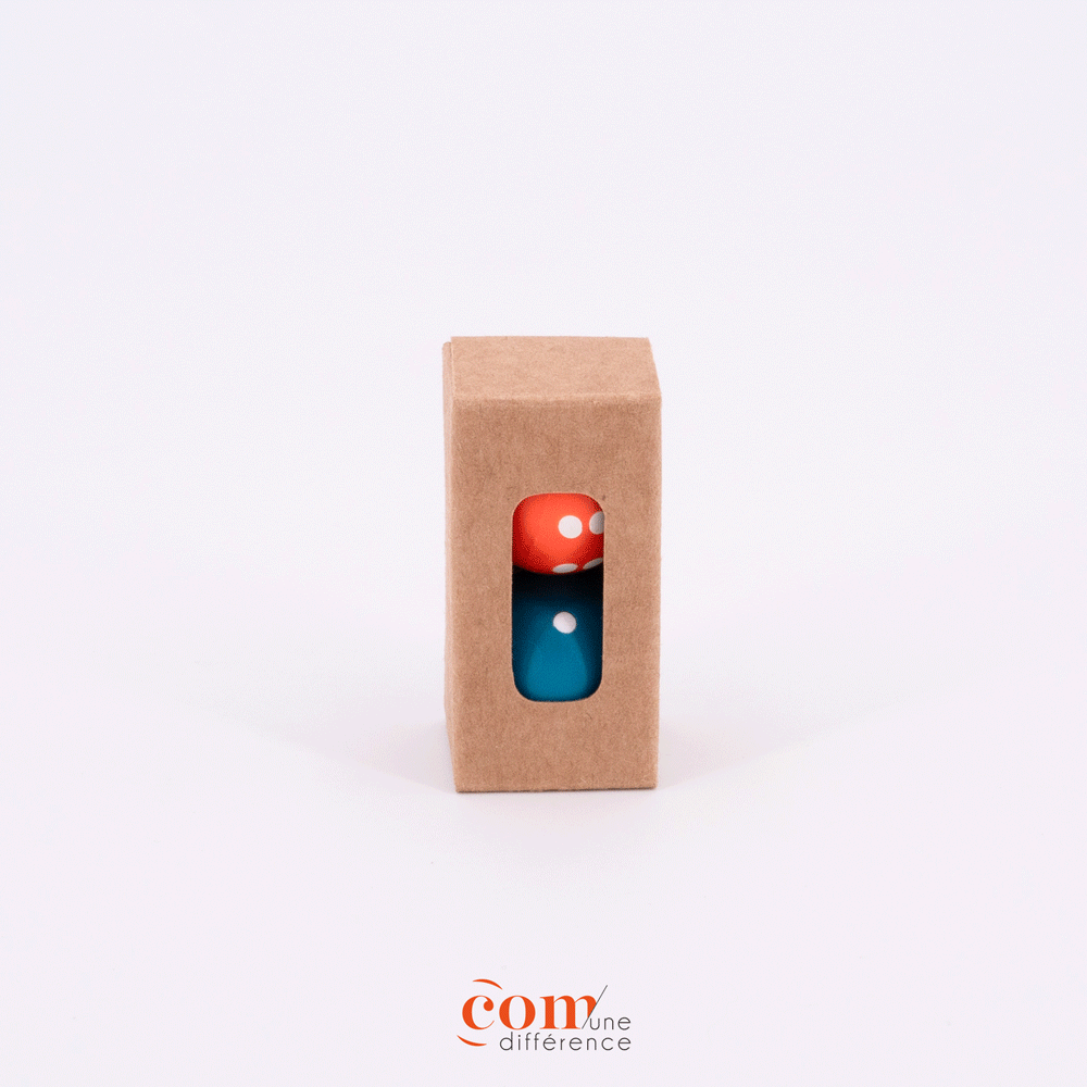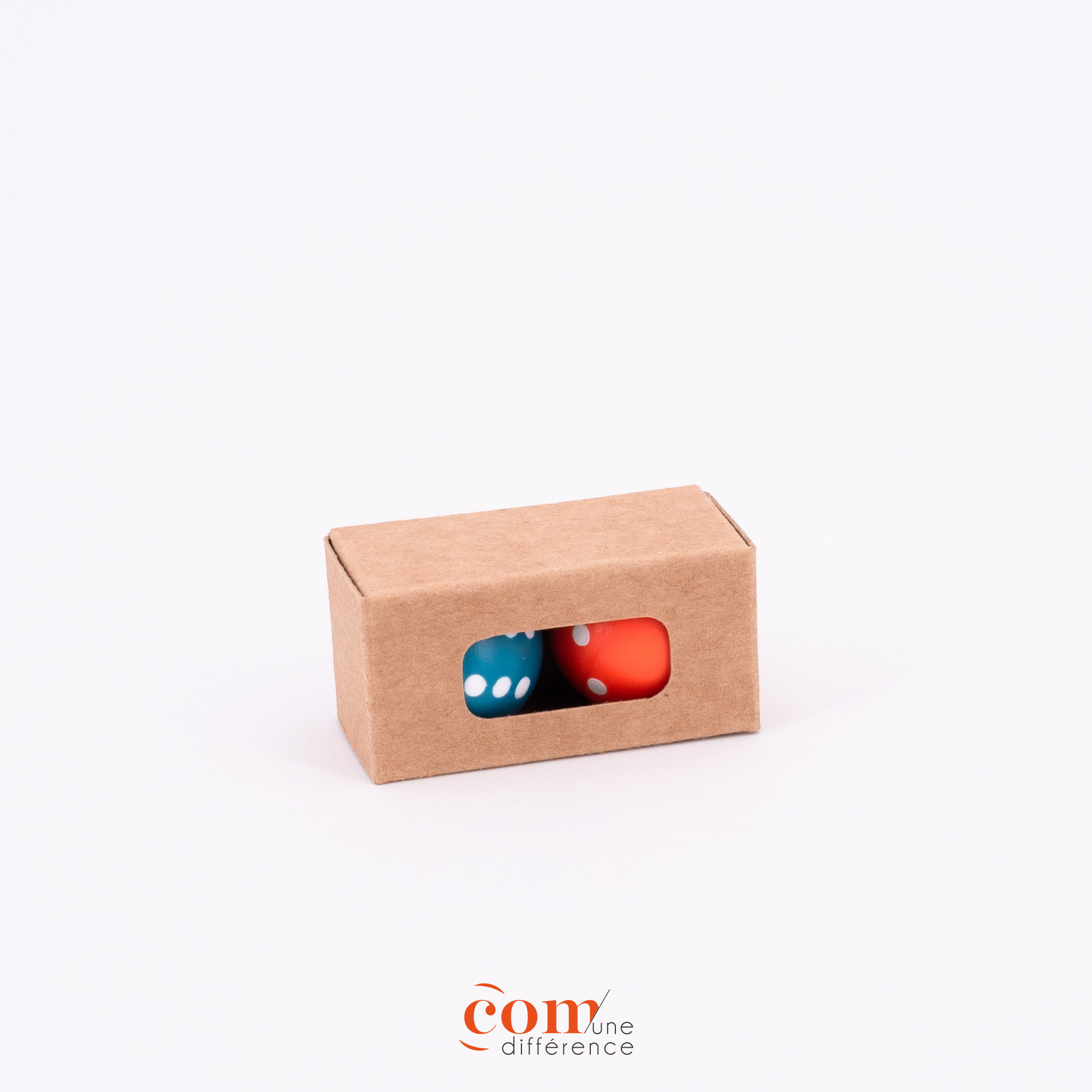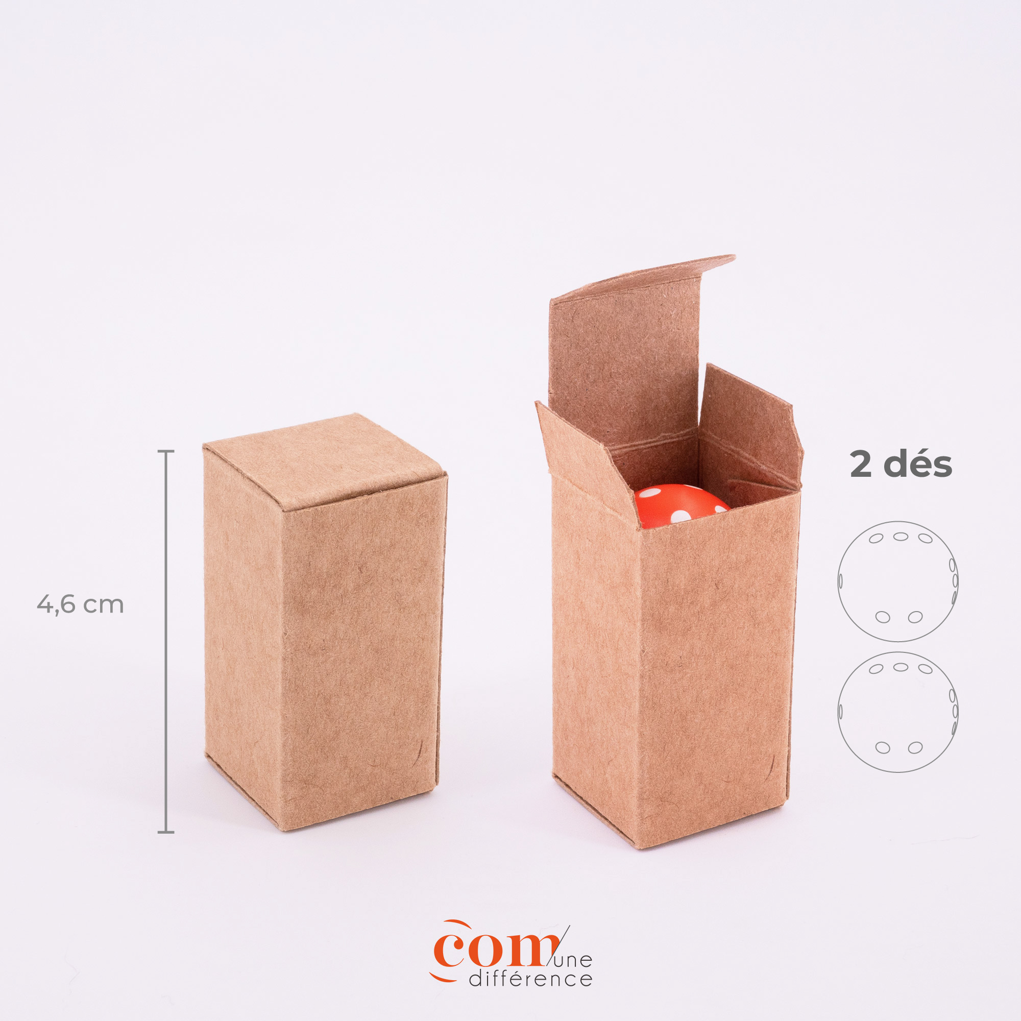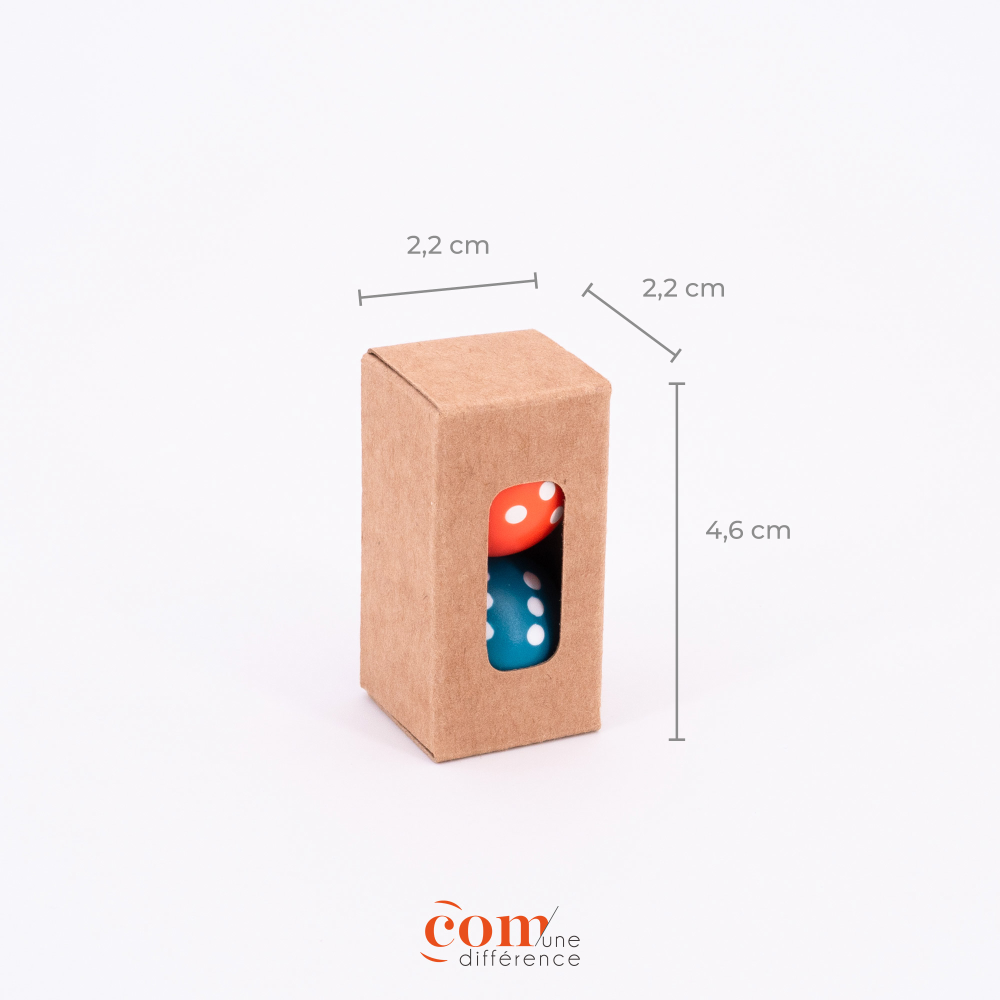 - Boite en carton kraft avec encoches d’ouverture. Dimensions 46 mm * 22 mm * 22 mm avec ouverture pour voir les dés insérés