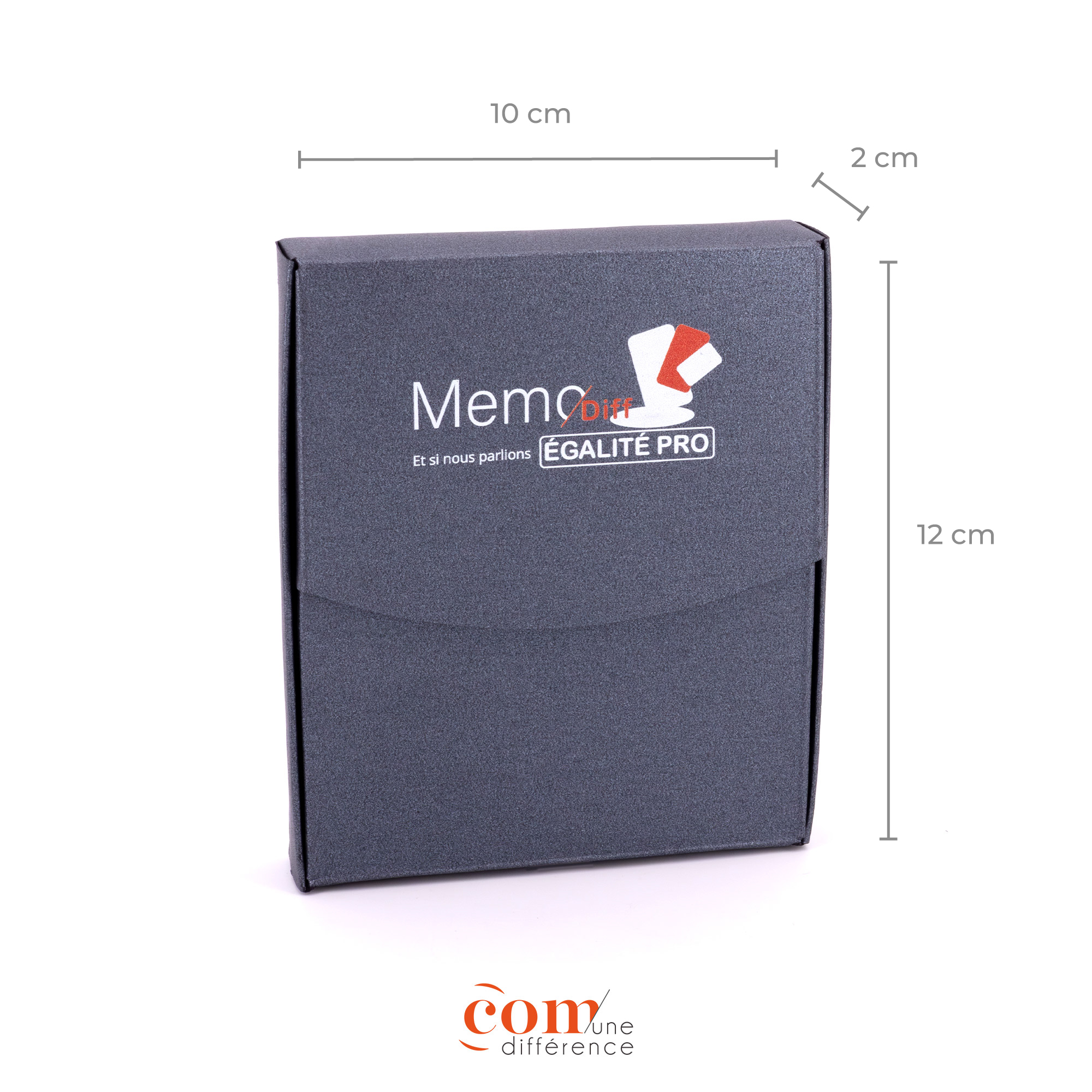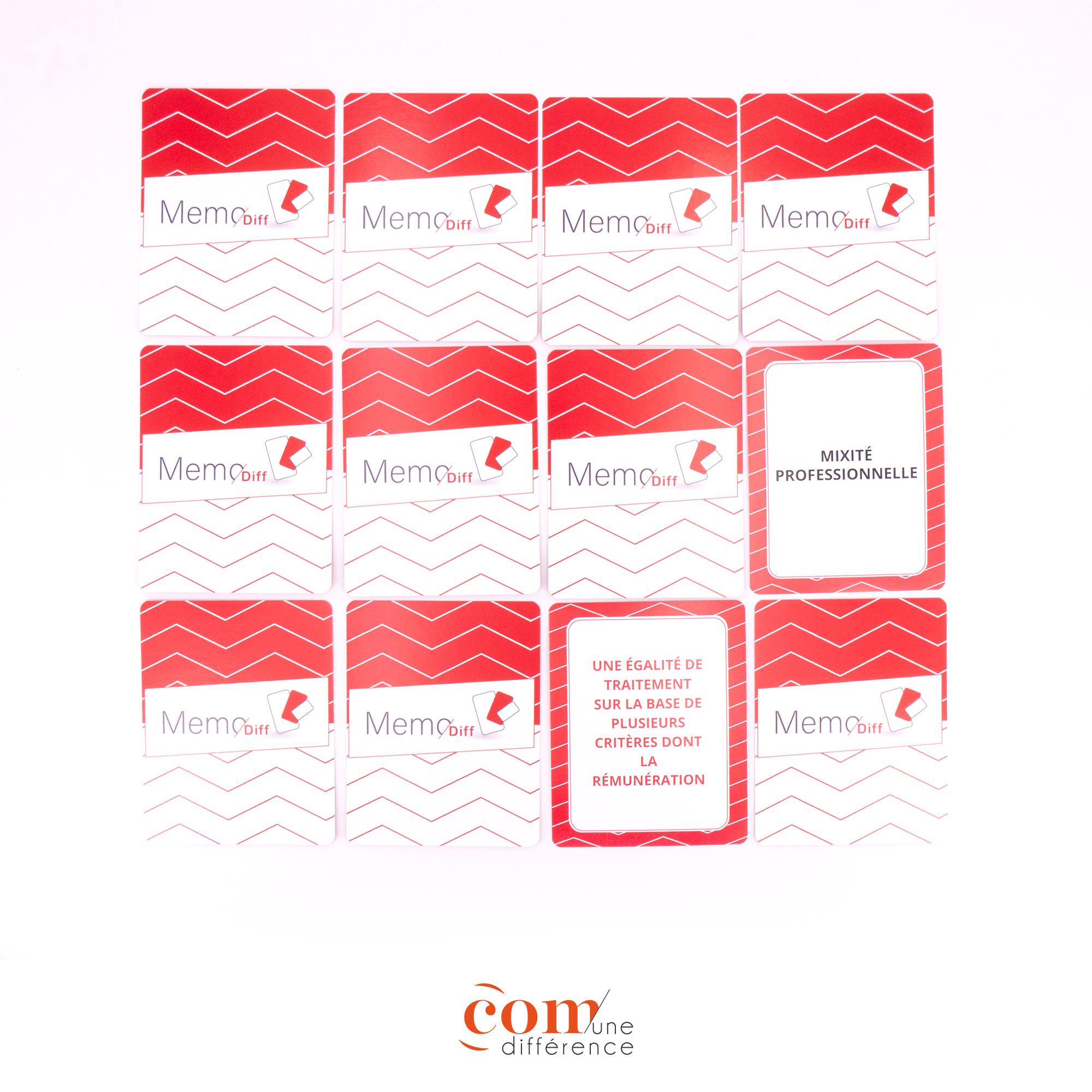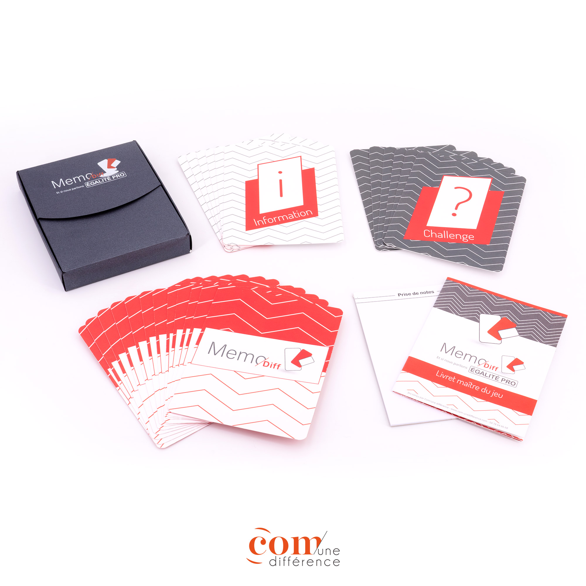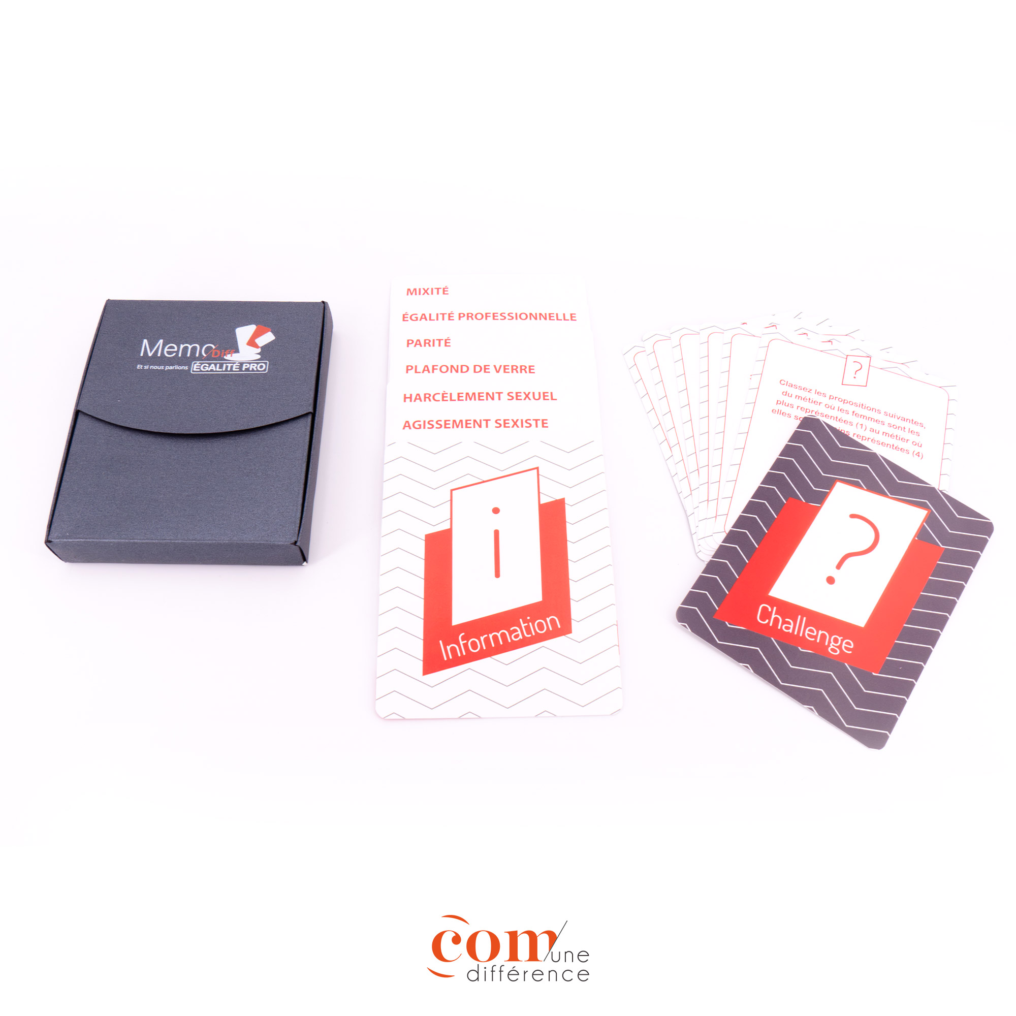 Un jeu de société sur l’égalité professionnelle entre les femmes et les hommes alliant memory et défis à relever pour mieux comprendre ce qu’est l’égalité professionnelle. Ce jeu se joue à 2 équipes. L’équipe qui a le plus de paires a gagné mais il faudra aussi relever des challenges … Des cartes « Information » permettent de tout comprendre sur les différents concepts autour de l’égalité pro (parité, agissement sexiste,…).