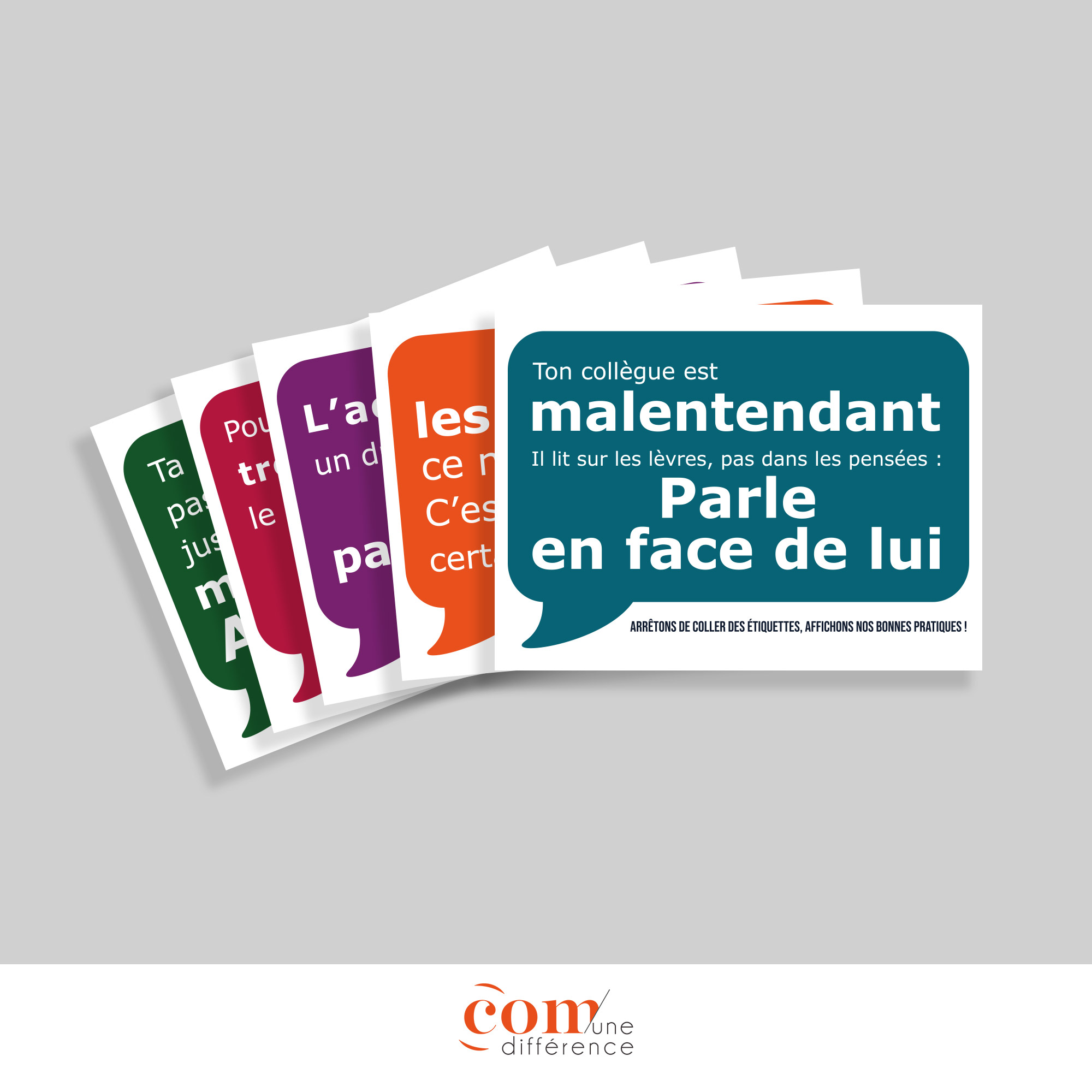 Chaque sticker transmet un message efficace : un besoin concret en lien avec le handicap, une information claire, une bonne pratique pour agir.