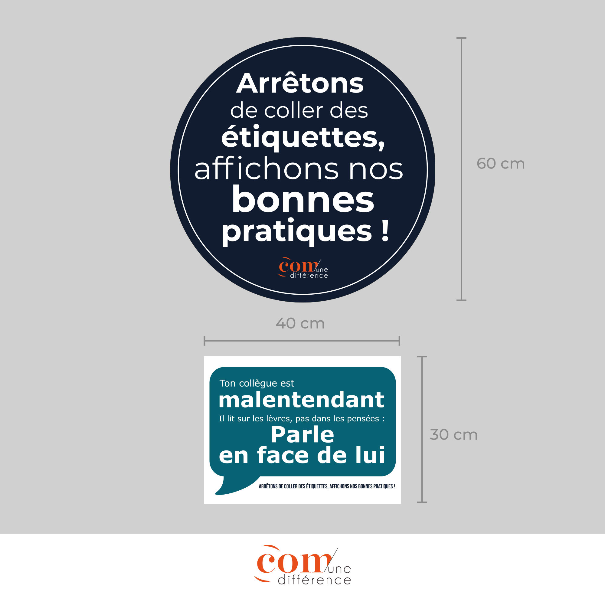 - 1 sticker géant « teaser »* (diamètre de 60 cm) qui présente la campagne et qui attise la curiosité : à disposer dans un lieu visible par tous (idéalement un hall d’accueil)